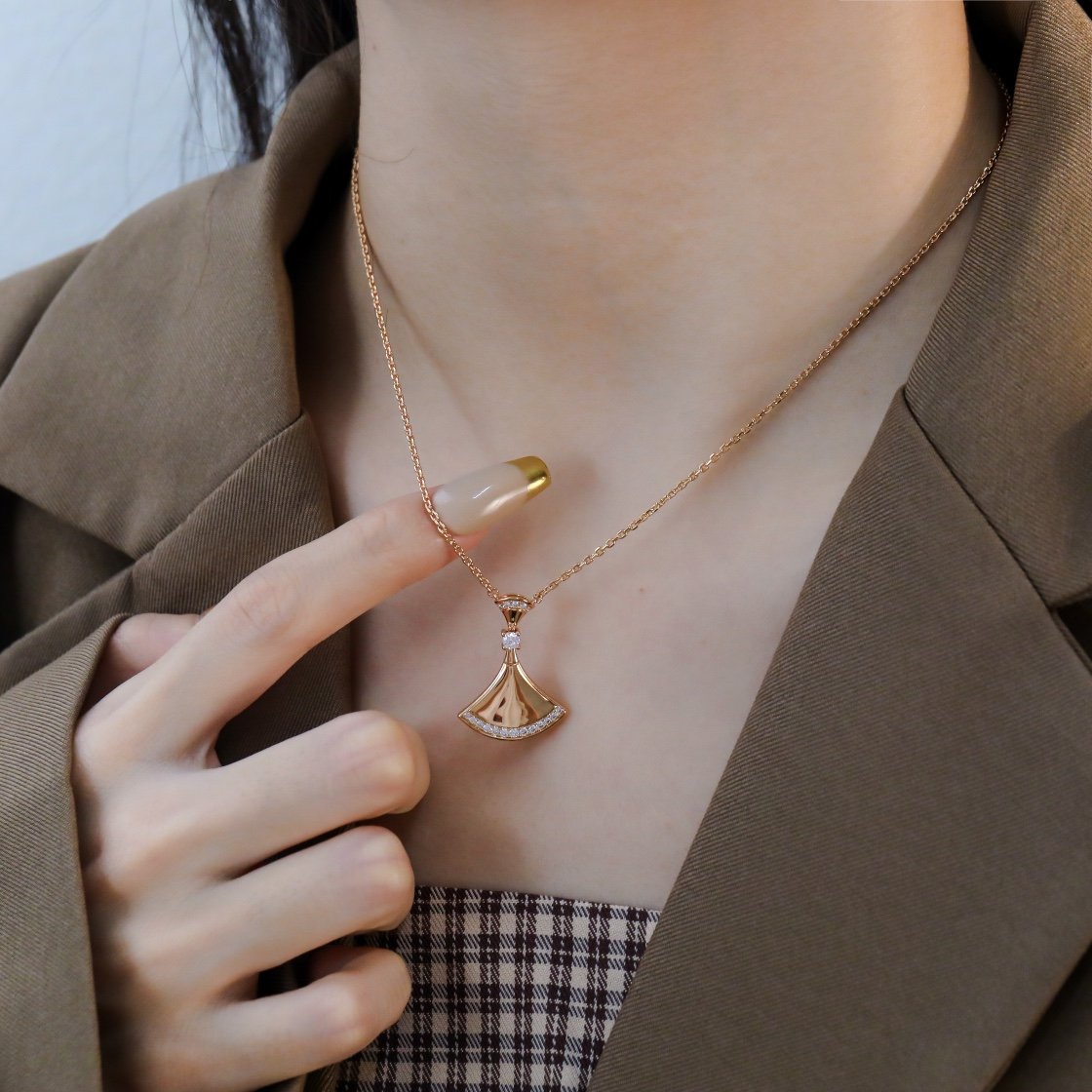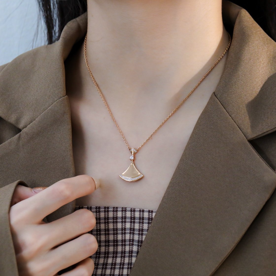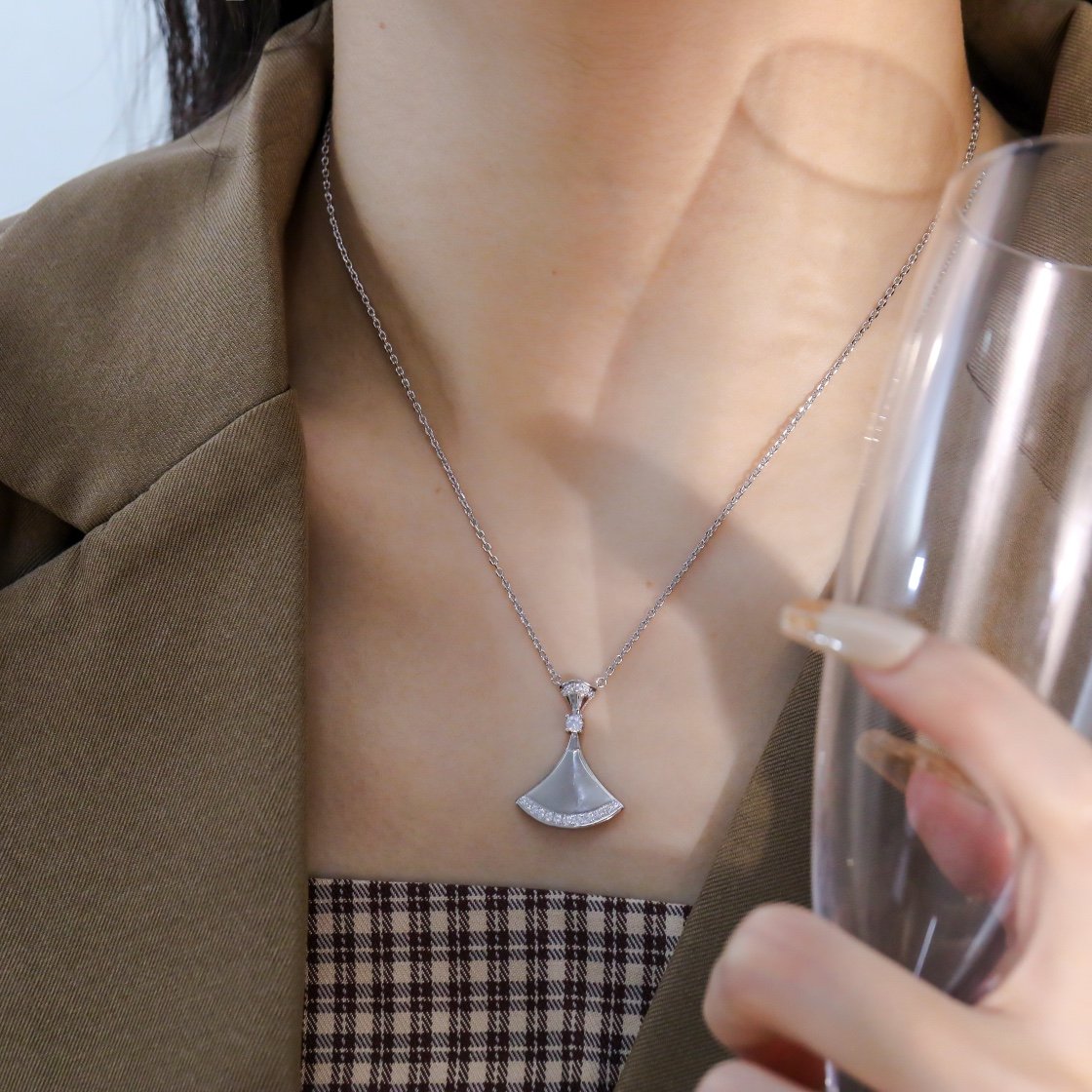 BV diamond studded large metal edged fan necklace
