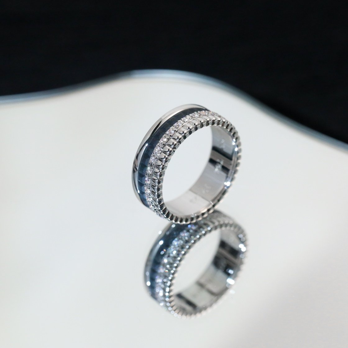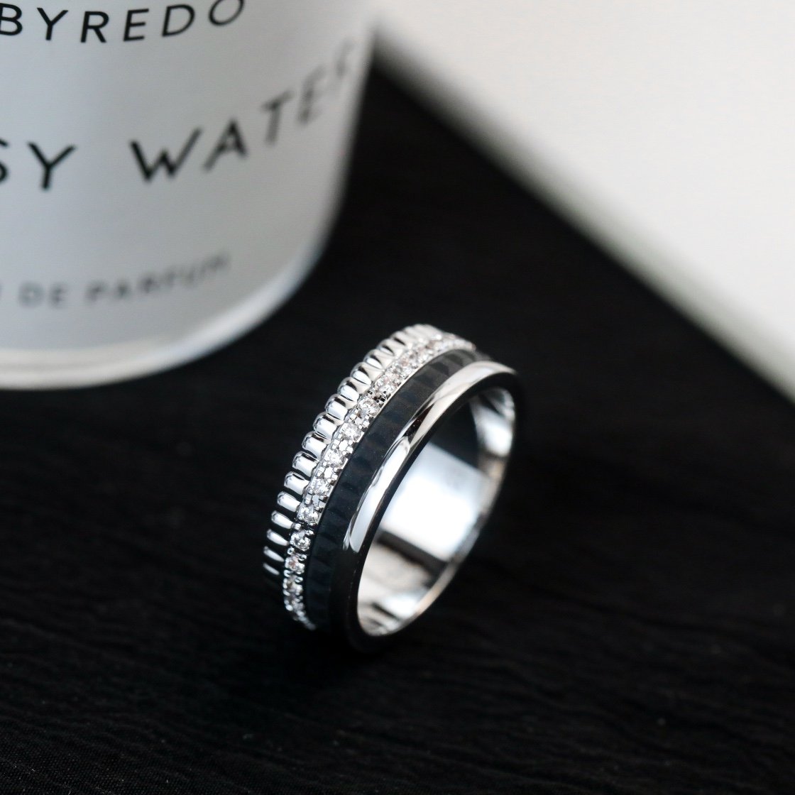 Wide diamond studded black ceramic ring